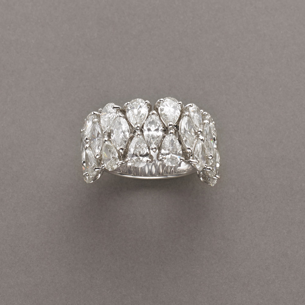 Anello a fascia per tre quarti lievemente snodato in oro bianco con diamanti a goccia e marquise, taglio a brillante modificato per complessivi ct.6,85 gr. 11,00 misura 14/54. Diamond white gold band
