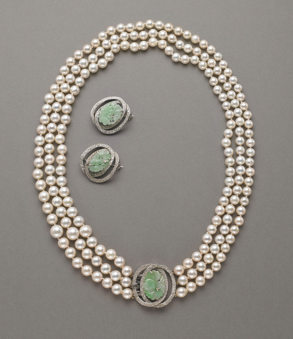 Demi-parure composta da collana di perle coltivate bianche Akoja, mm 6,50/7 con chiusura in oro bianco, diamanti taglio huit-huit e giadaite incisa con due broches più piccole che ne compongono la demi-parure, per un totale di g.124,60 Cultured Akoja pearl demi-parure comprising a three strand necklace with diamond and white gold clasp and two brooches