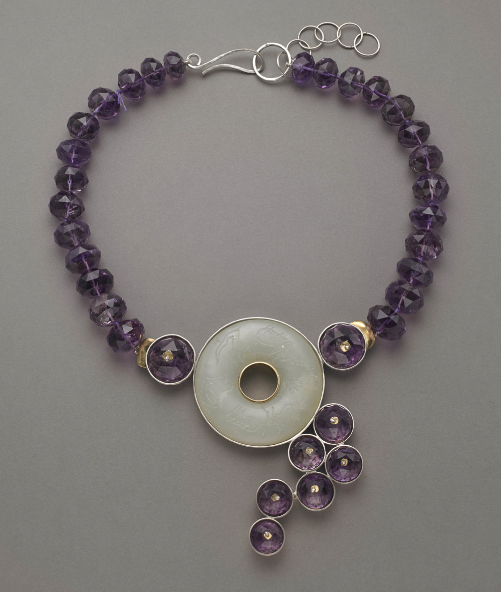 Collana di boules ovoidali sfaccettate di ametista con al centro incorniciata una giada incisa, tutto rifinto in oro e argento, per complessivi g.228,70 Faceted amethyst bead necklace centered by a jade, gold and silver medallion
