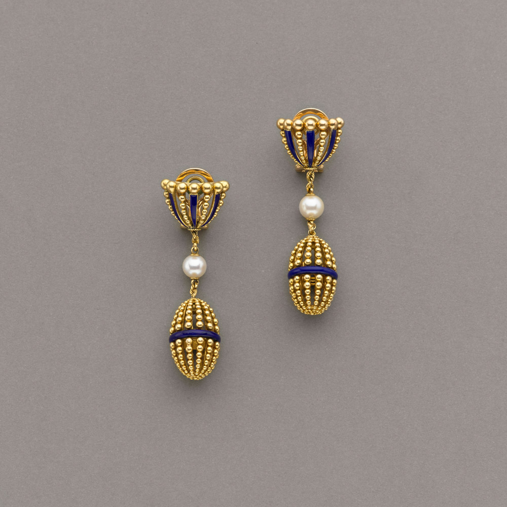Orecchini pendenti in oro giallo con lavorazione a pallini e smalto blu con una perla bianca coltivata a snodare il pendente, g.28,90 Blue enamel and cultured pearl gold ear pendants