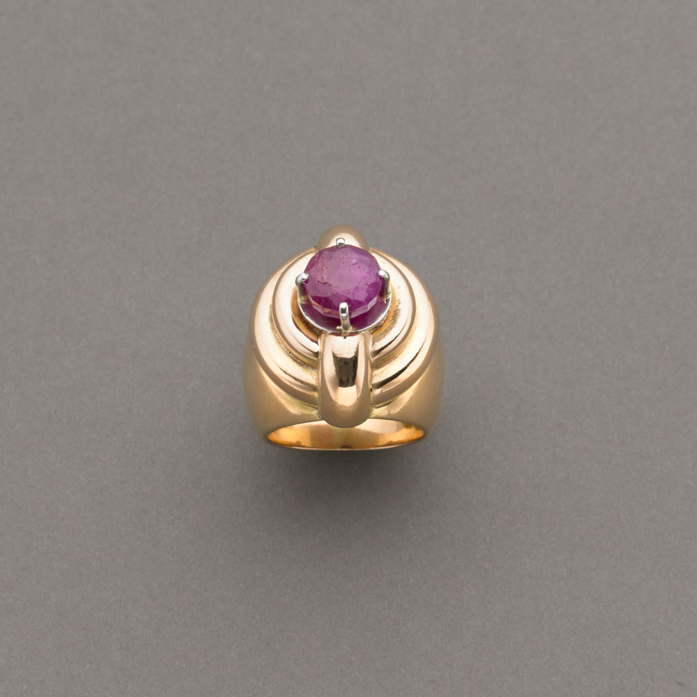 Anello d'epoca bombato in oro giallo e griffes in oro bianco con rubino...