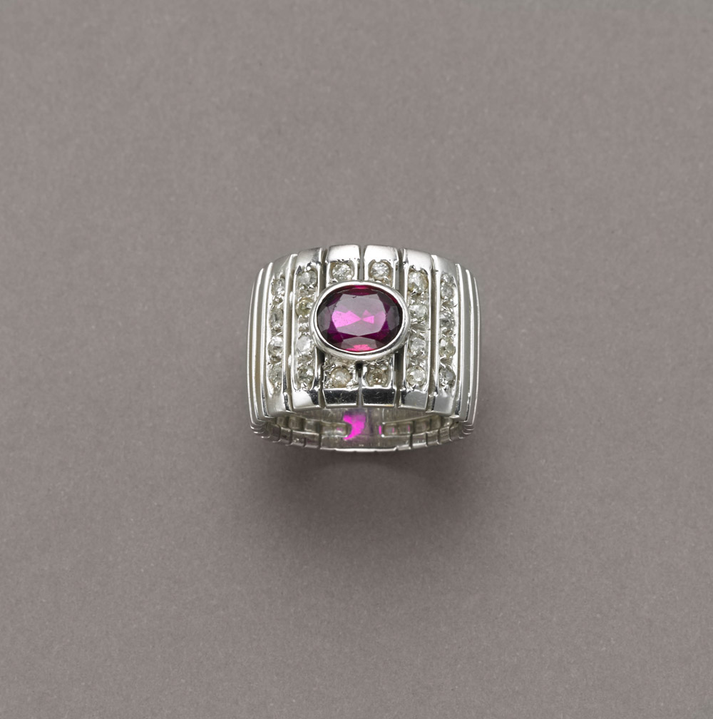 Anello a fascia in oro bianco con diamanti rotondi e rubino ovale taglio...