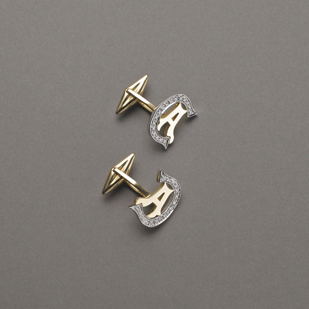 Gemelli in oro giallo e bianco con iniziale C A, dove la C ha incastonati...