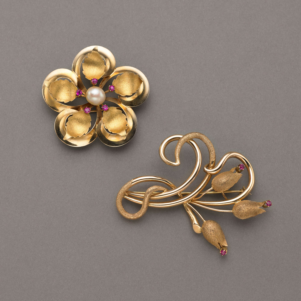 Due spille in oro giallo satinato e lucido, una a fiore con al centro una perla e cinque rubini a ricordare i pistilli e l'altra a mazzo di tulipani con tre rubini, per complessivi g.22,40 Lot comprising two gold brooches one with pearls and rubies the other with rubies
