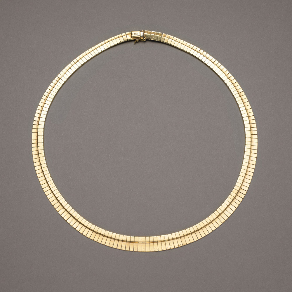 Girocollo a scalare, piatto, semi-rigido, lucido e satinato, g.44,70, lungh. 44cm Fancy link flat gold necklace