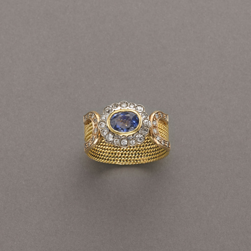 Anello in oro giallo e rosso a nove fili intrecciati tenuti da due C capovolte ed al centro uno zaffiro ovale contornato da diamanti rotondi, g.6,30, misura: 19/59 Diamond and sapphire bi-coloured gold ring