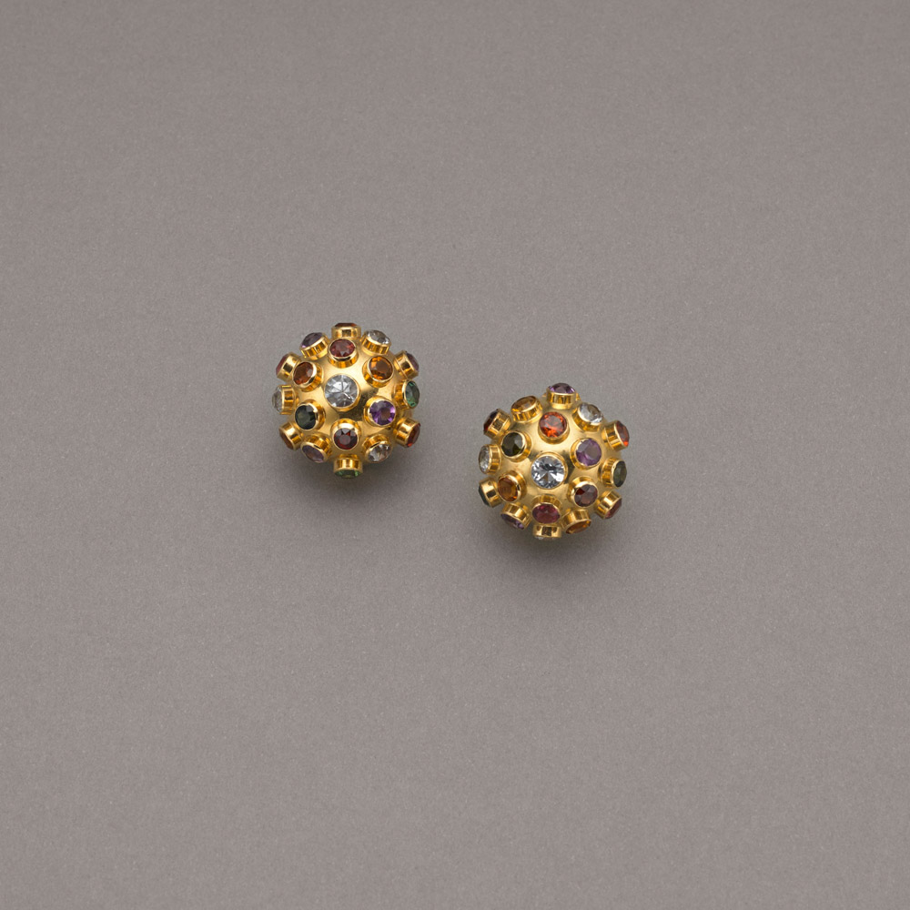 Orecchini a lobo perno e clips in oro giallo a forma di mezze boules con incastonate pietre di vari colori, g.9,80 Multi-coloured stone ear-studs