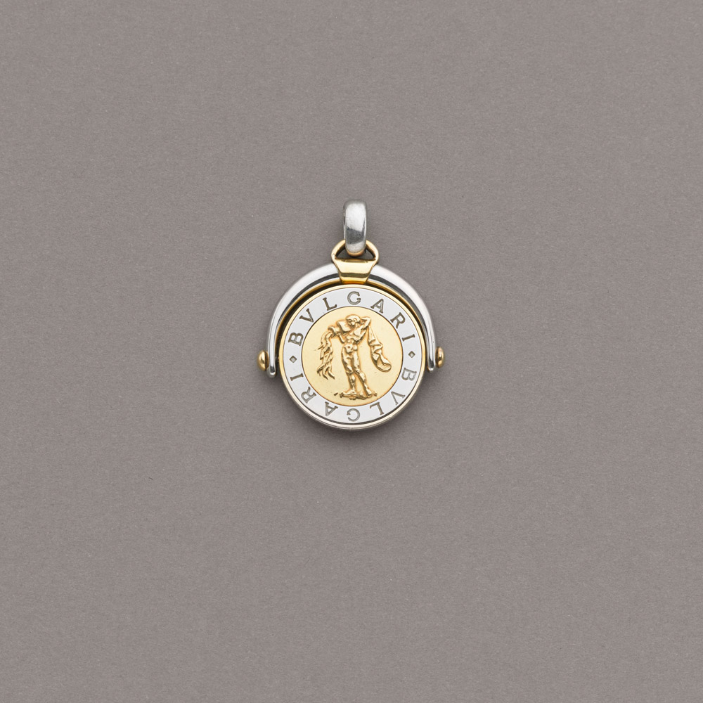 Pendente in acciaio, oro bianco e giallo con medaglia basculante, segno zodiacale dell'acquario in rilievo, 13,60, BVLGARI Bi-coloured gold and steel Acquarius pendant. Bulgari