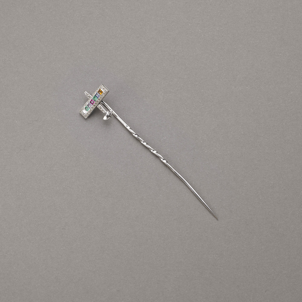 Spillone firmato Cartier in oro bianco a guisa di aereo impreziosito da piccoli diamanti e piccole pietre carré colorate. g. 2,70 Diamond and white gold tie pin, signed Cartier