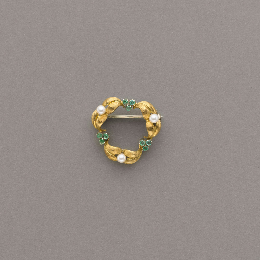 Spilla a ghirlanda con foglie satinate in oro giallo e bianco, perle e smeraldi, g.6,60 Pearl, emerald and bi-coloured gold brooch
