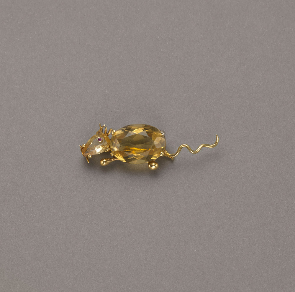 Spilla a guisa di topolino con quarzi citrini e piccolo rubino tutto in oro giallo, g 4,70 Citrine quartz and ruby gold mouse brooch