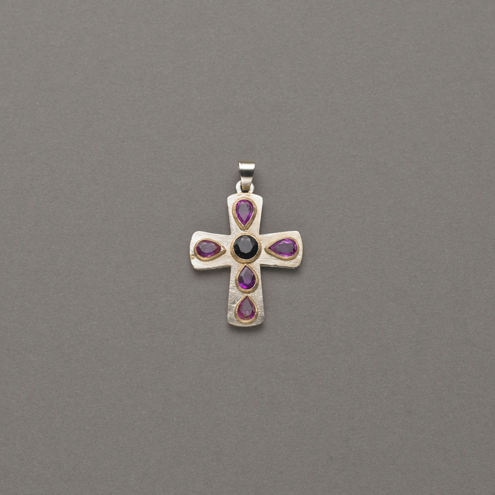 Croce in oro bianco satinato con castoni in oro giallo e 5 rubini a goccia...