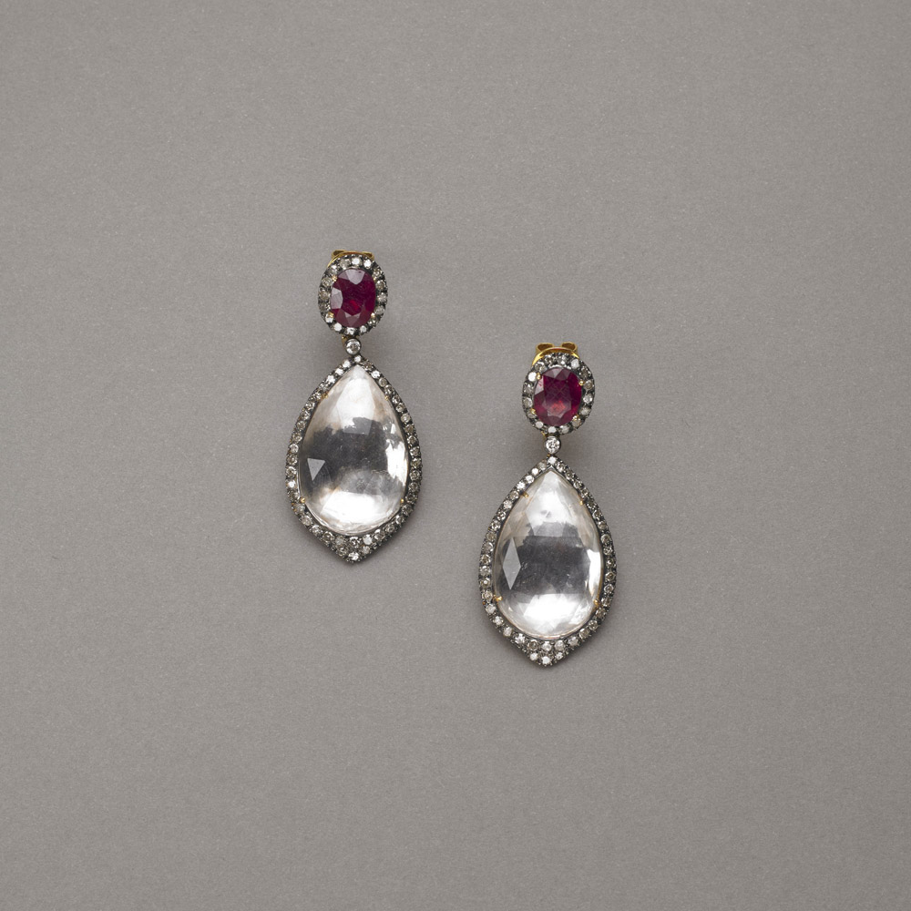 Orecchini pendenti oro e argento con due rubini ovali ct.7,44, due cristalli di rocca a goccia e diamanti per complessivi ct.1,74. gr. 17,10 Rock crystal, ruby and diamond silver and gold pendant earings
