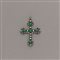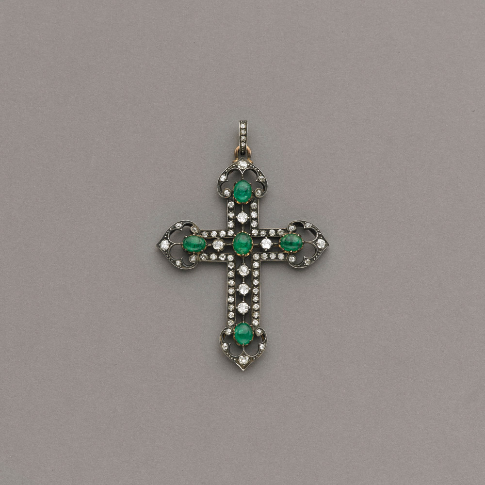 Crocefisso d'epoca in argento e oro giallo con diamanti rotondi taglio a brillante vecchio europeo e quattro smeraldi ovali taglio cabochon, complessivi g.12,90 Diamond and emerald silver and gold vintage crucifix