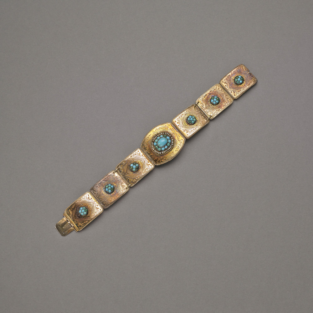 Bracciale d'epoca in oro giallo inciso 585/1000 a segmenti rettangolari più centrale con turchese cabochon e microperline, g.23,10 Micro-pearl and turquoise gold bracelet