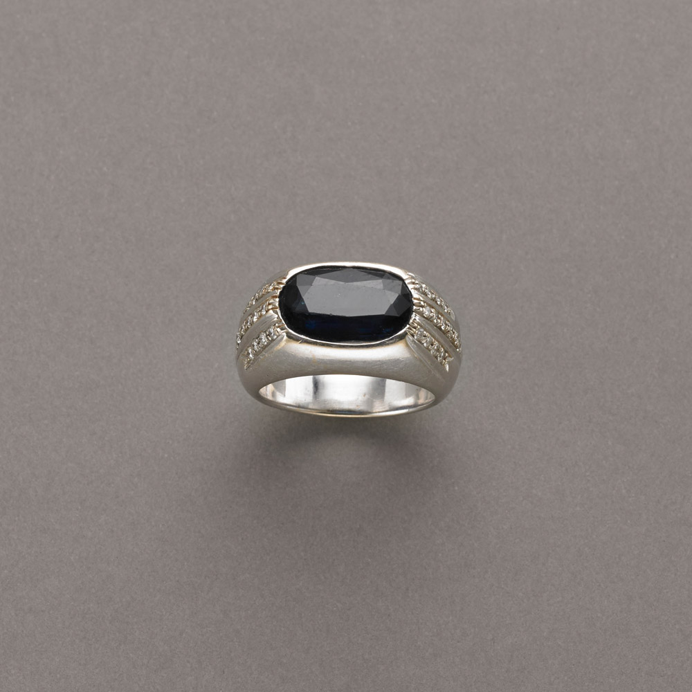 Anello in oro bianco con zaffiro ovale taglio composito in orizzontale a guidare la forma dell'anello dal quale tre file opposte di diamanti rotondi taglio brillante ne seguono il gambo, g.16,40, misura: 11/51 Sapphire and diamond white gold ring