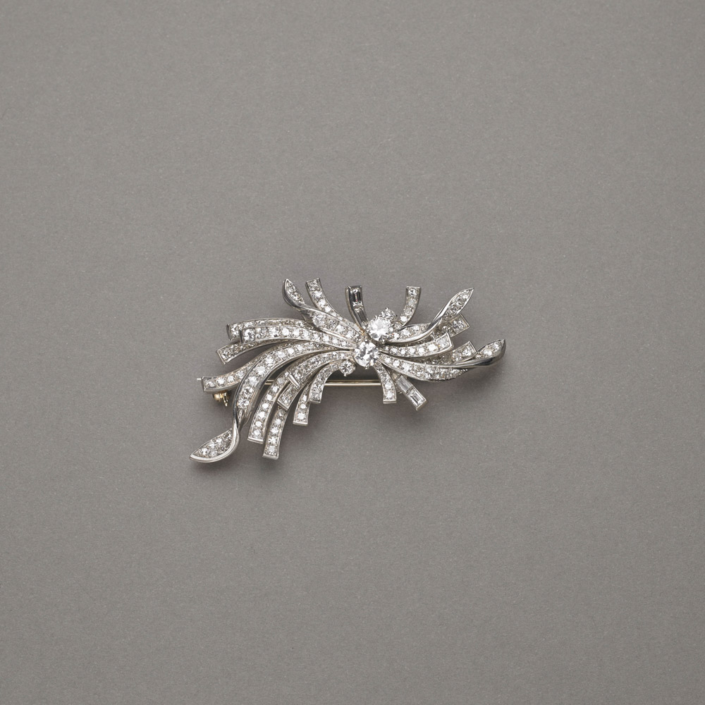Broche in platino a guisa di nastro con diamanti rotondi taglio a brillante vecchio europeo, huit-huit e baguette. g.24,30. Diamond and platinum "Bow" brooch
