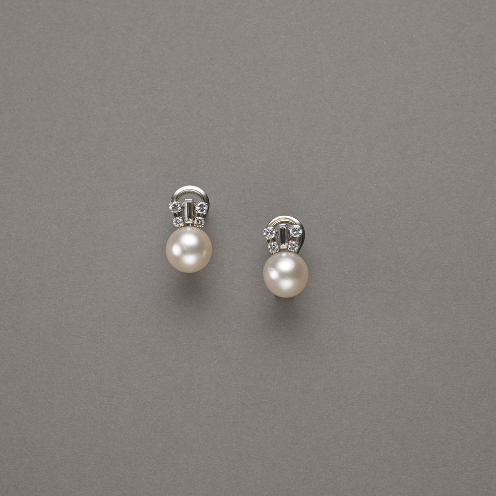 Orecchini in oro bianco con due perle coltivate bianche Akoja 10/10,50mm con diamanti tondi taglio brillante e due diamanti forma baguette, g.11 Cultured Akoja pearl and diamond white gold earings
