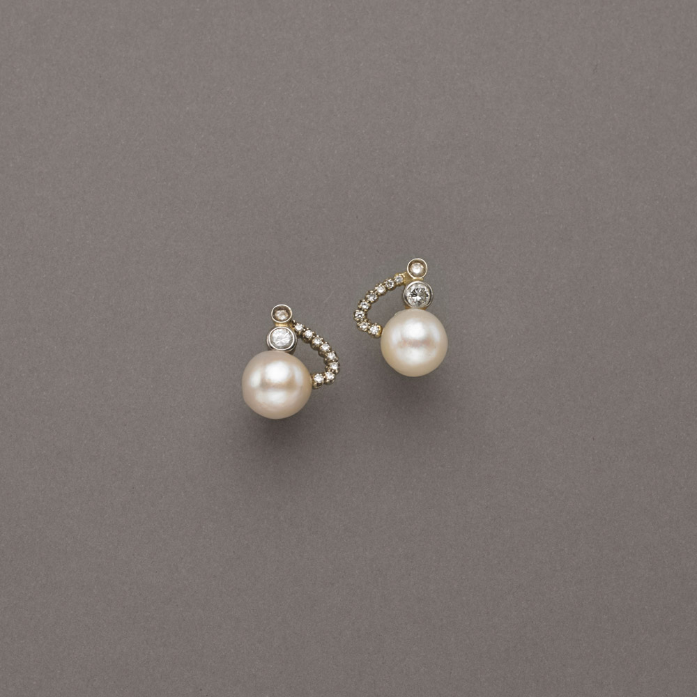 Orecchini in oro bianco e giallo con diamanti rotondi e due perle bianche coltivate 9,50/10mm, g.6,10 Bi-coloured gold diamond and cultured pearl earings