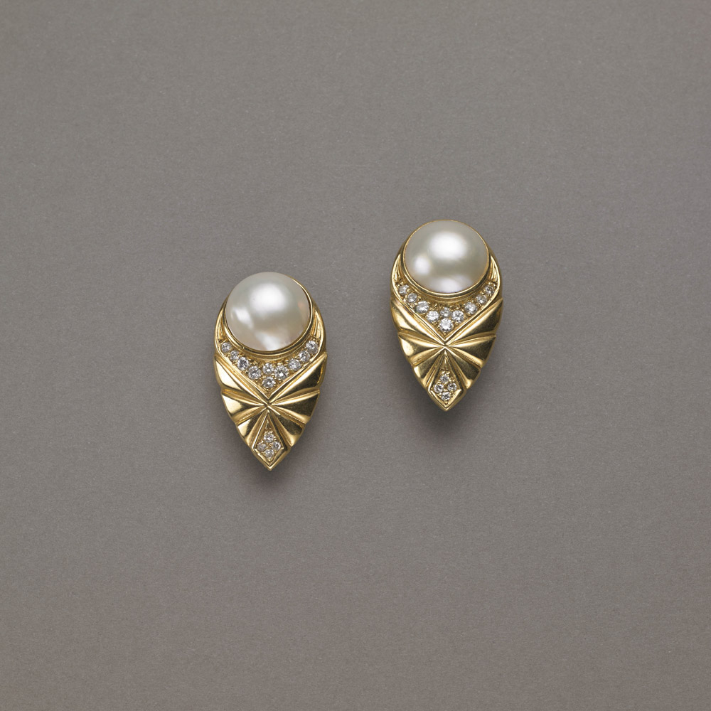 Orecchini a lobo perno e clips in oro giallo a guisa di goccia con due perle mabé, diamanti tondi taglio brillante, g.22,30 Mabé pearl and diamond gold ear-studs
