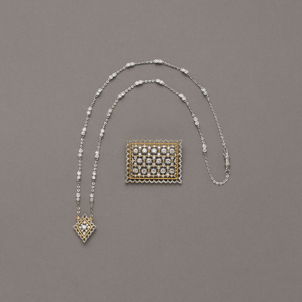 Demi-parure formata da catena con ciondolo e spilla/ciondolo in oro bianco e giallo con lavorazione puntinata e diamanti rotondi taglio a brillante, per complessivi g.24,70 Diamond and bi-coloured gold demi-parure comprising a chain with pendant and a brooch/pendant