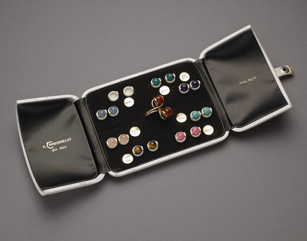 Anello contrarié in oro giallo con boules di varie pietre "dure" intercambiabili g 4,20 misura 14/54 aperto sotto, brevettato mod. 16/S, con astuccio originale. FLAVIO RICCI. Hardstone crossover gold ring with interchangeable stones, with original case. Flavio Ricci