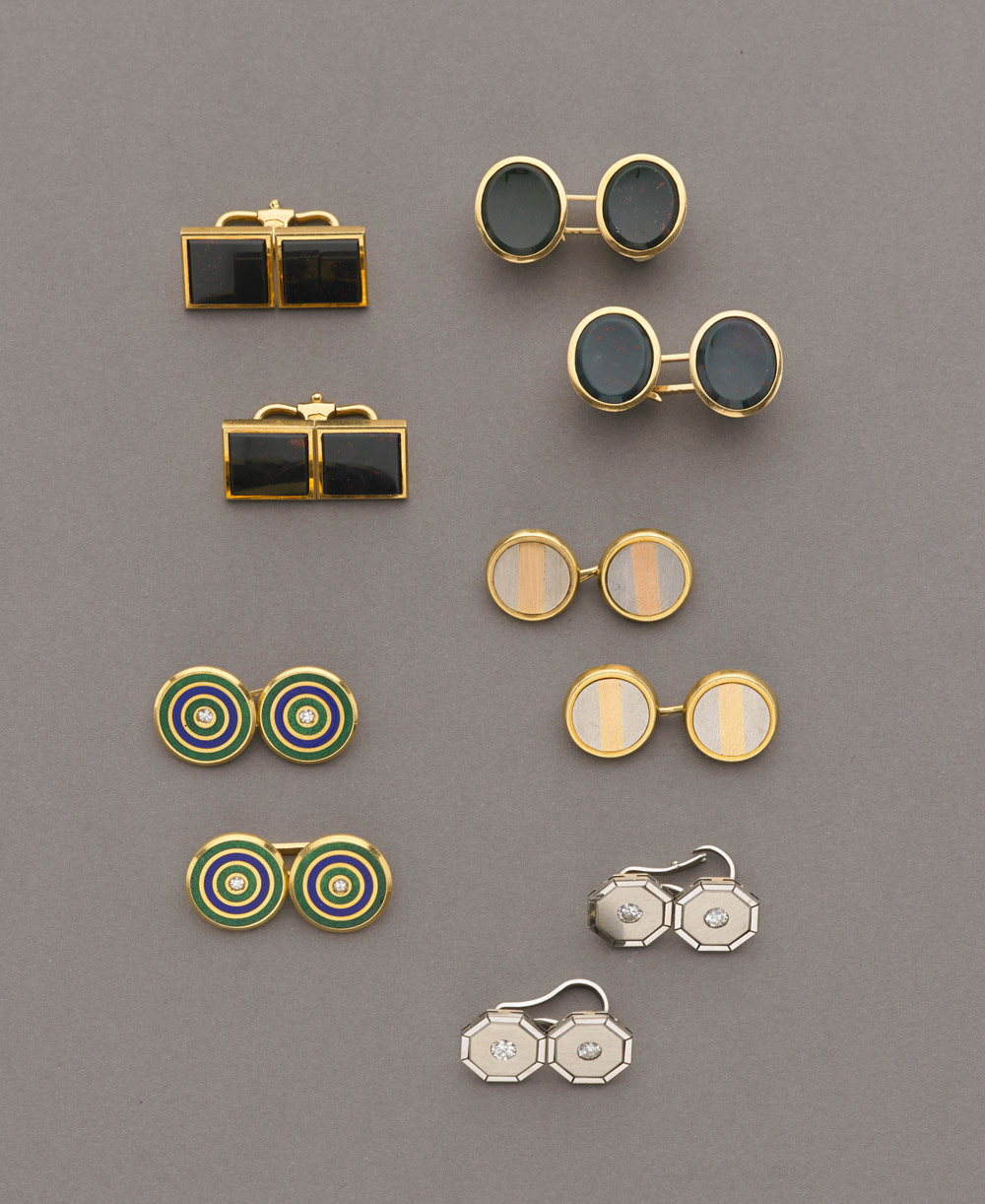Cinque paia di gemelli in oro bianco e giallo di varie forme e dimensioni con...