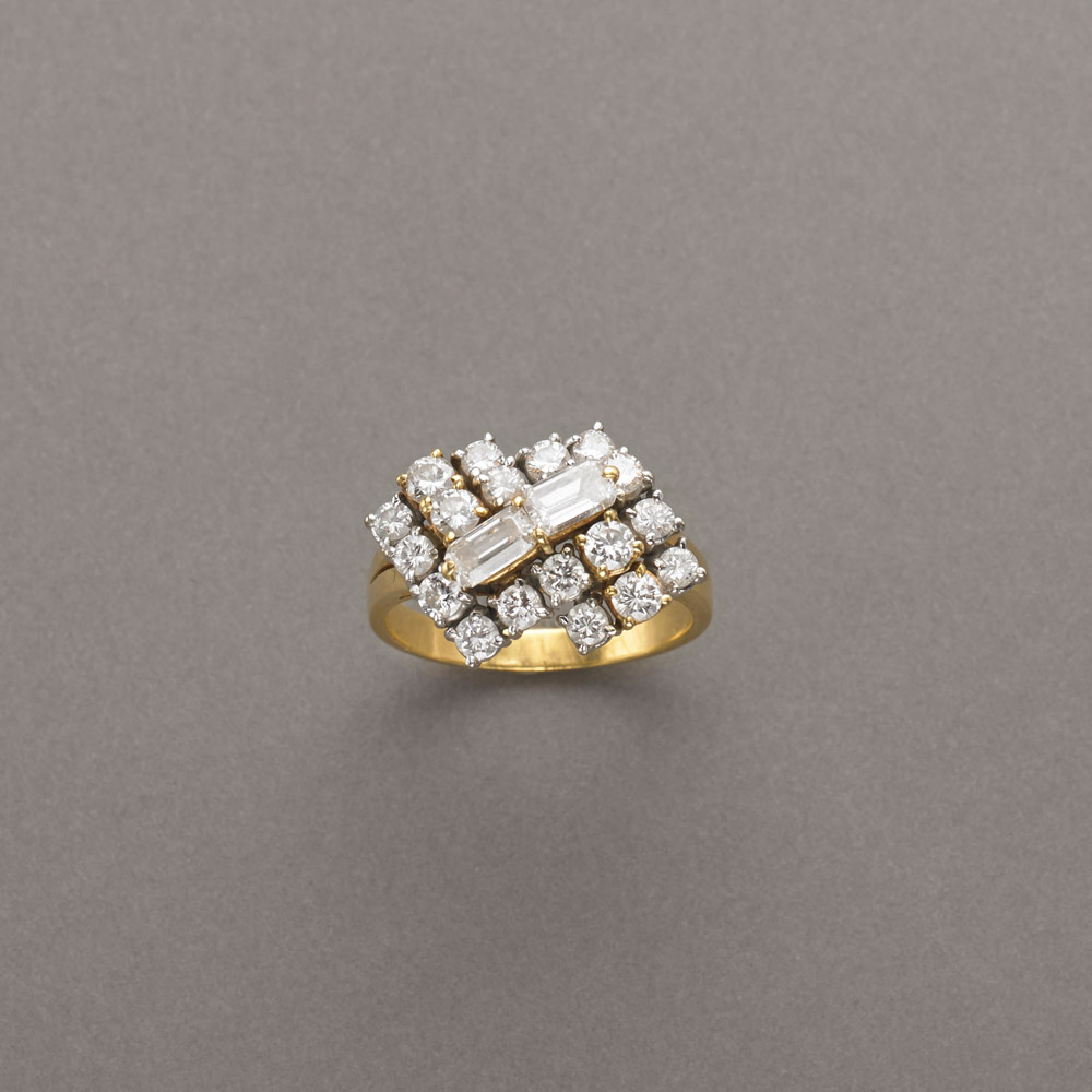 Anello in oro giallo e bianco con due diamanti a baguette contornati da sedici diamanti rotondi taglio a brillante, g.6, misura: 15/55 Bi-coloured gold diamond ring