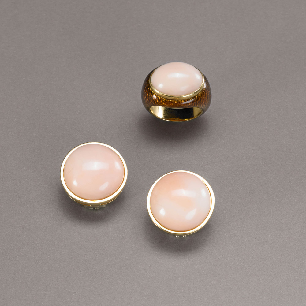 Demi-parure in oro giallo: anello da "mignolo" con smalto brown guillochè e cabochon ovale di corallo rosa, misura: 9/49 e orecchini rotondi a lobo con clips in oro bianco e cabochon rotondi di corallo rosa, per complessivi g.34,10 Gold enamel and coral demi-parure comprising a ring, a pair of earclips