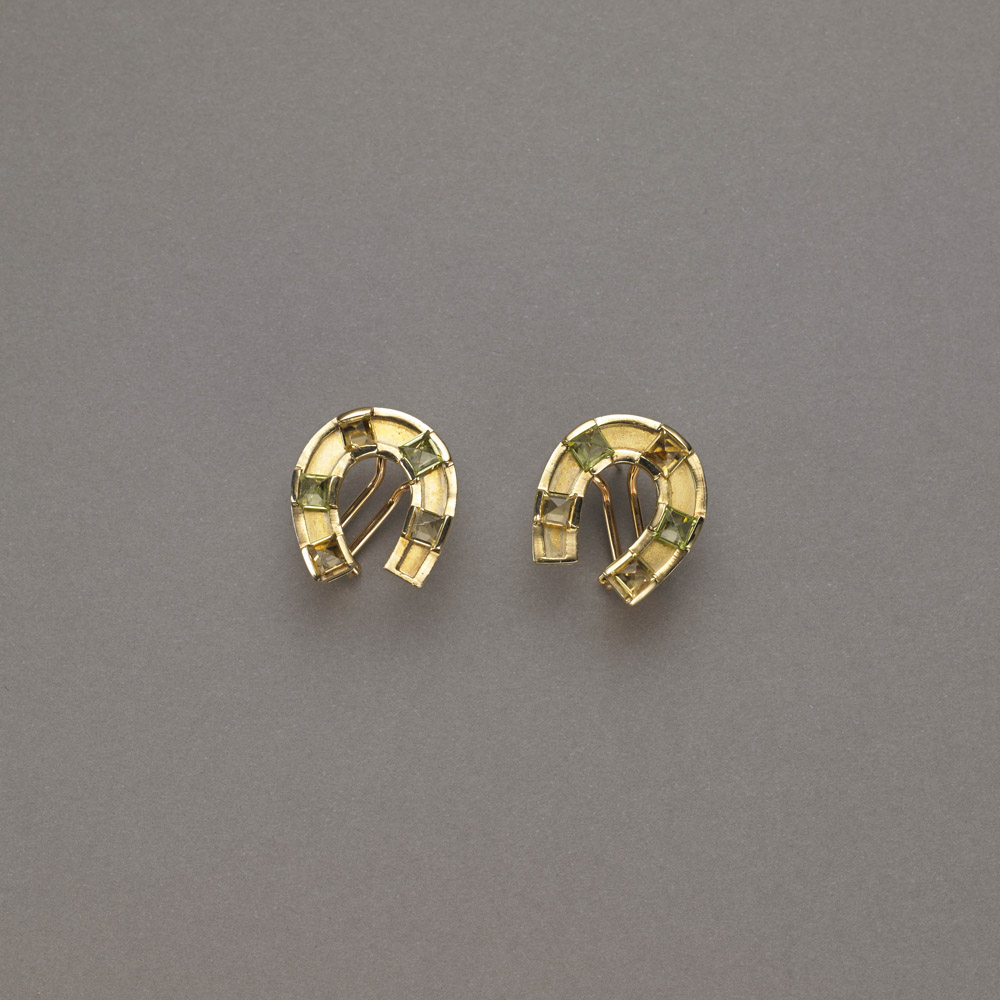 Orecchini a lobo clips e perno in oro giallo a forma di ferro di cavallo, con paste vitree verdi e gialle, g.14,20. Ritz Saddler Vitreous paste horse-shoe gold ear-studs. Ritz saddler