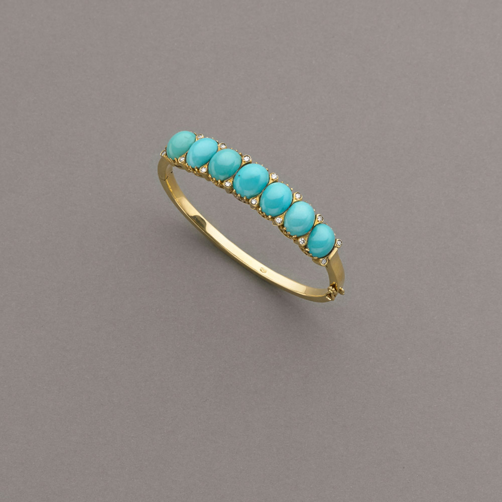 Bracciale in oro giallo con sette turchesi cabochon ovali e diamanti taglio...