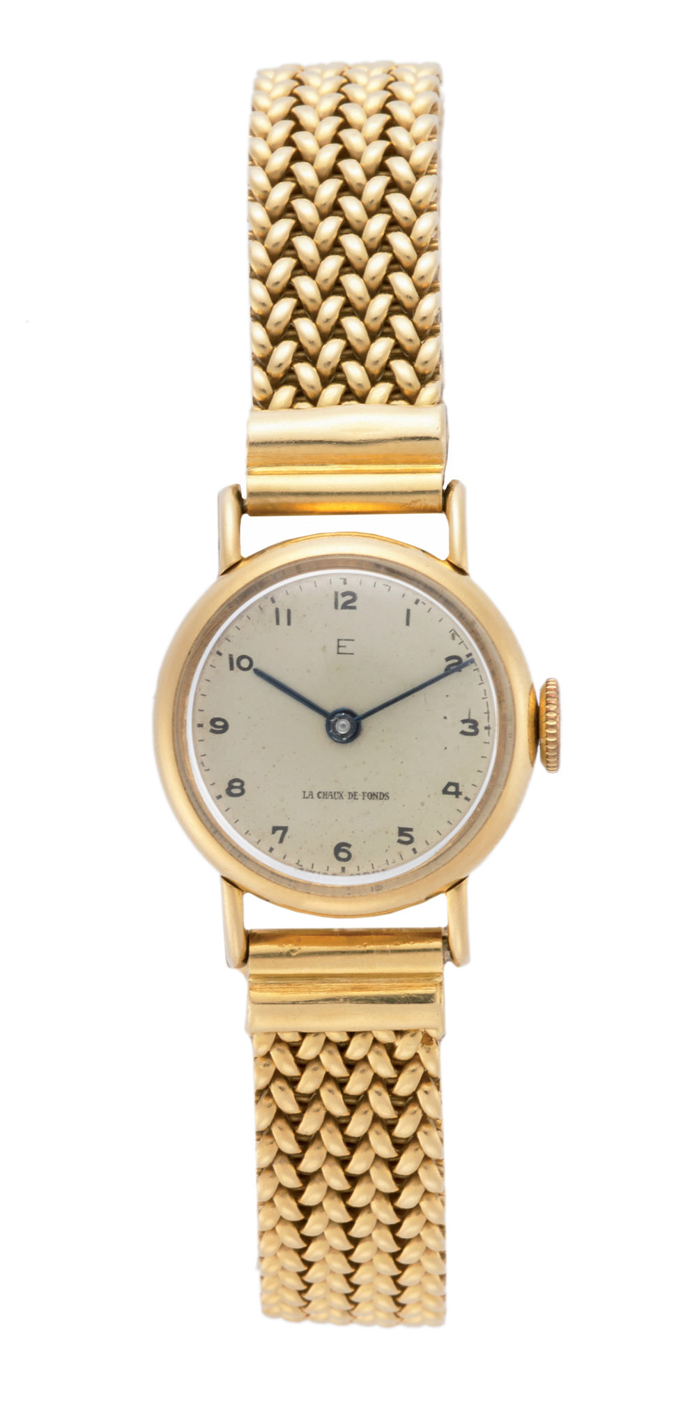 EBERHARD&CO. Orologio da polso da donna in oro 18K con bracciale non pertinente Anni 1950 ca. Quadrante, movimento e cassa firmati, movimento a carica manuale, quadrante argentato con cifre arabe, cassa n.372415, diam. 20mm EBERHARD&CO. lady's 18K gold wristwatch, 1950s circa Manual-wind movement, silver-plated dial with Arabic numerals. Dial, movement and case signed
