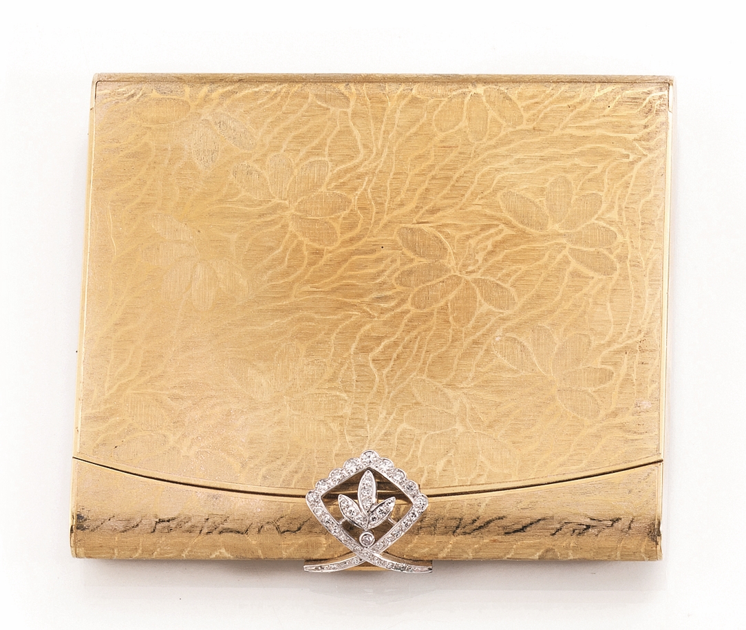 la scatola con profilo rettangolare presenta decorazione floreale in oro giallo satinato, chiusura in brillanti taglio huit huit e oro bianco, corredata di astuccio, il porta rossetto analogamente decorato, g 242 complessivi lordi