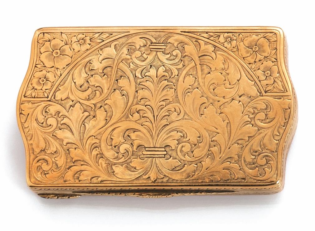 SCATOLA IN ORO GIALLOdi forma sagomata in oro giallo interamente inciso a...