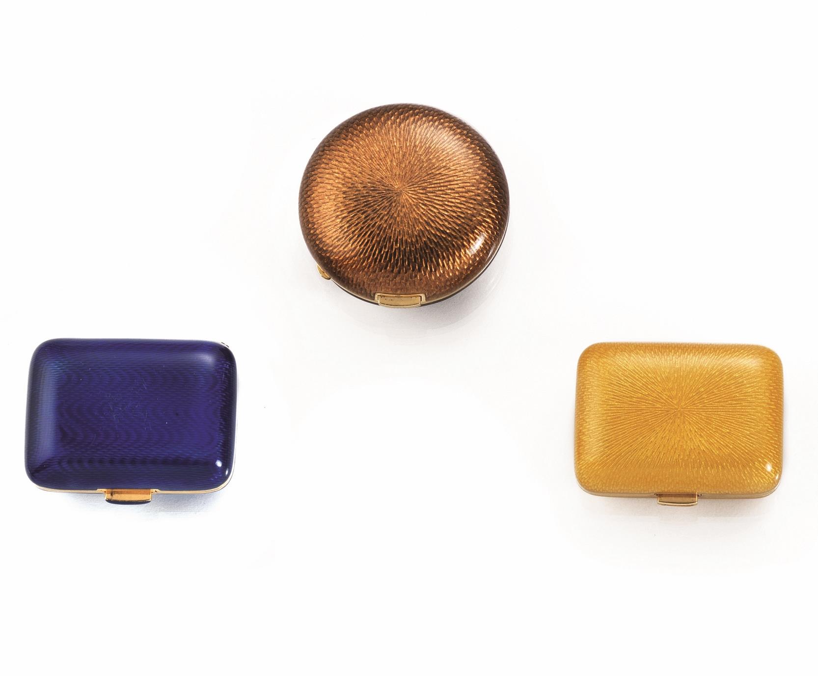 rispettivamente di forma rettangolare in oro giallo con lavorazione a guilloche decorata da smalto blu; di forma rettangolare con smalto giallo guilloche; l'altra di forma circolare lavorata a guilloche con smalto color castagno, g 139 lordi complessivi