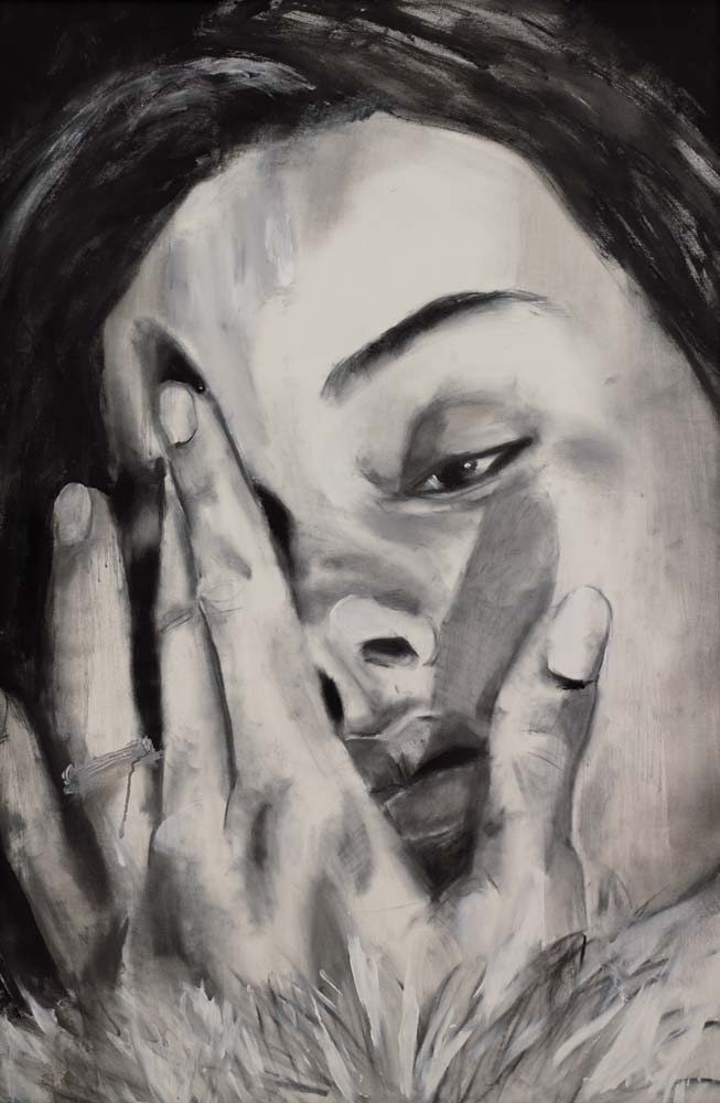 FABIO GIAMPIETRO Milano 1974 Viso con mano, 2002 tecnica mista su tela cm. 150x100, firma, anno ed etichetta della Transit Artist Management al retro.