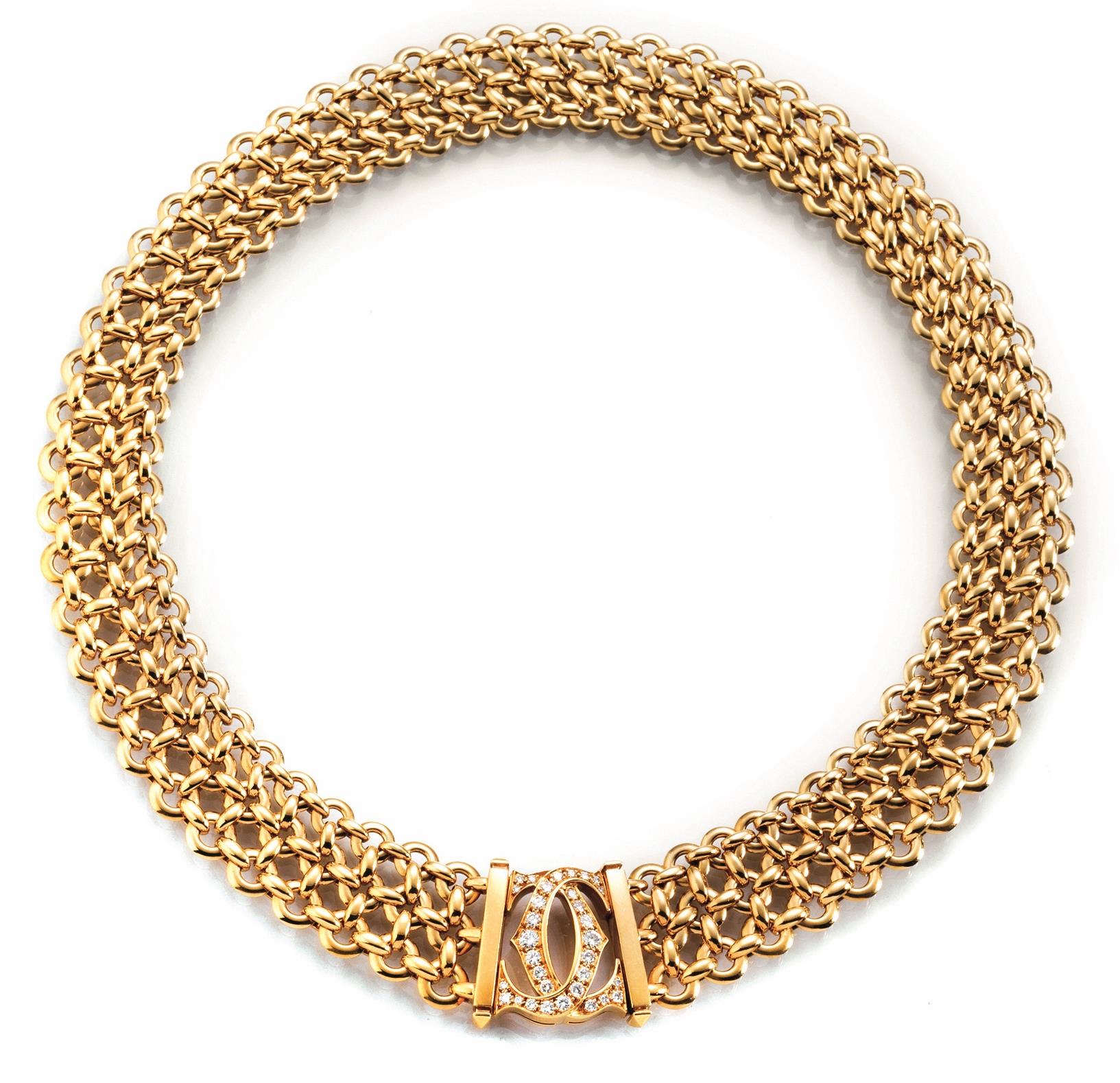 realizzata a tre file di maglie ad anello, fermatura a doppia "C" in brillanti, en suite con il bracciale, punzoni Cartier e 750, corredata di certificato e scatola, g 125