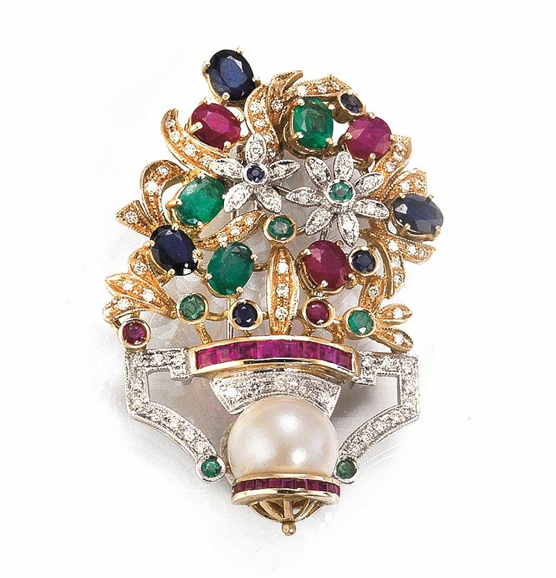 modellata a giardinetto con fiori in diamanti e pietre di colore, al centro una perla diam. mm 12.5, g 27