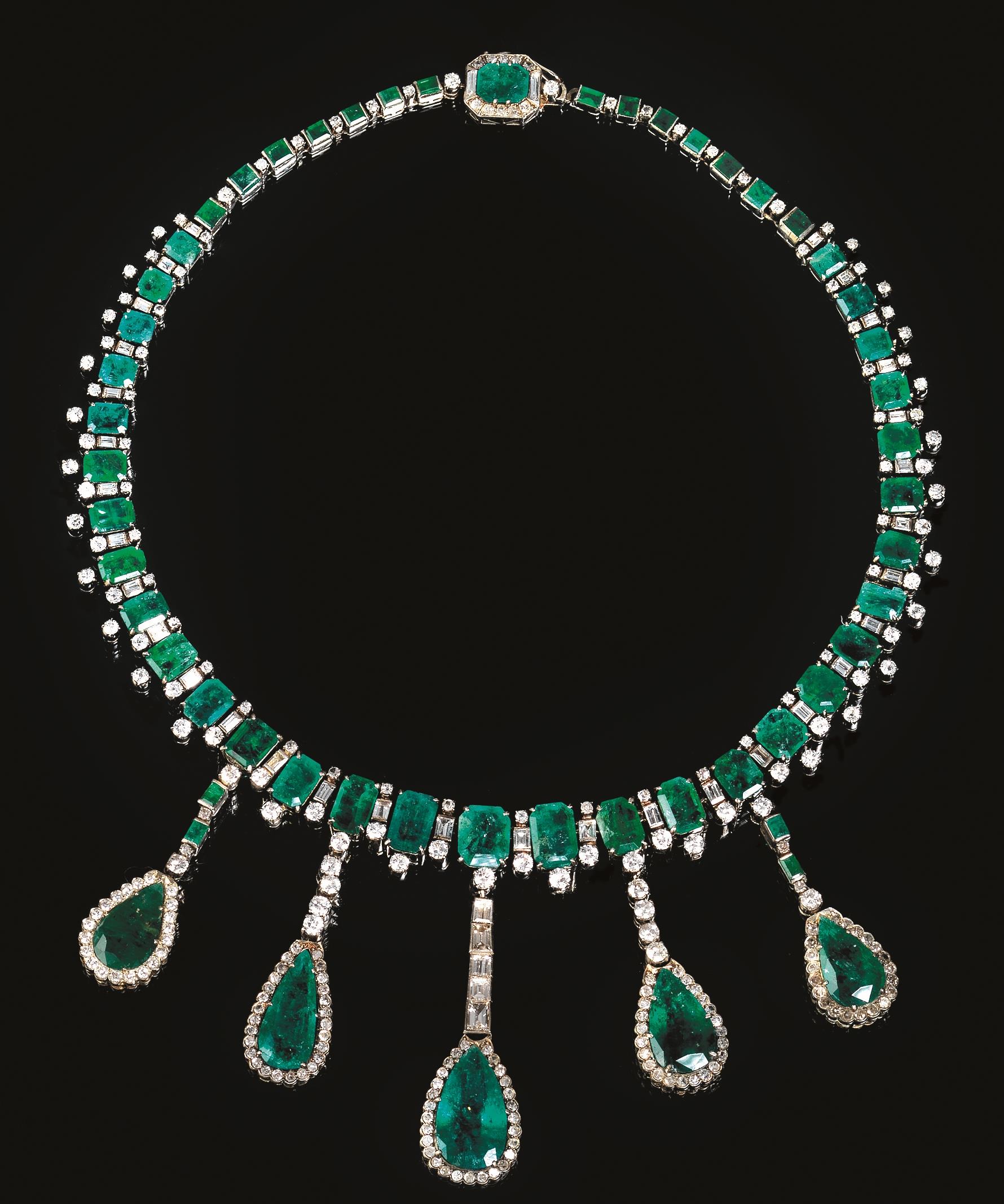 realizzata ad una fila di smeraldi rettangolari posti in gradazione alternati a brillanti rotondi e baguette, a cui sono sospese cinque linee pendenti in brillanti e baguette con finali gocce di smeraldi entro cornice di brillanti, g 79