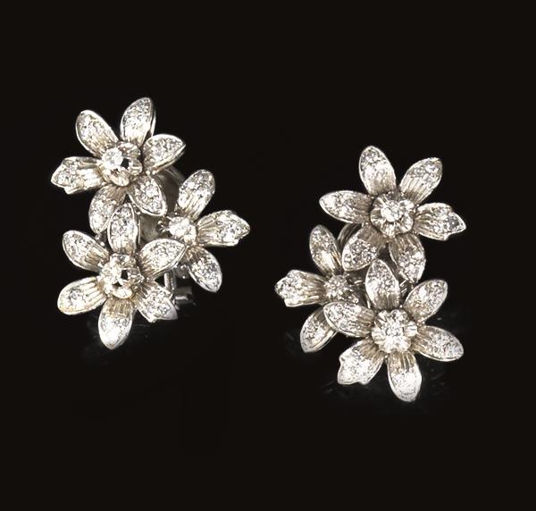 PAIO DI ORECCHINI IN ORO BIANCO E DIAMANTIciascuno realizzato con tre corolle...