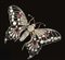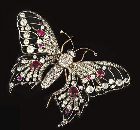 disegnata come una farfalla traforata decorata da rubini ovali e brilalnti di taglio vecchio e rose, punzone 750, corredata di catenina in oro giallo, g 33
