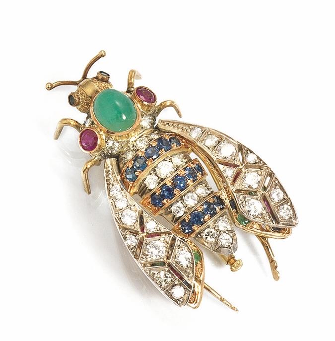 SPILLA IN ORO GIALLO, ORO BIANCO, RUBINI, ZAFFIRI, SMERALDI E DIAMANTI