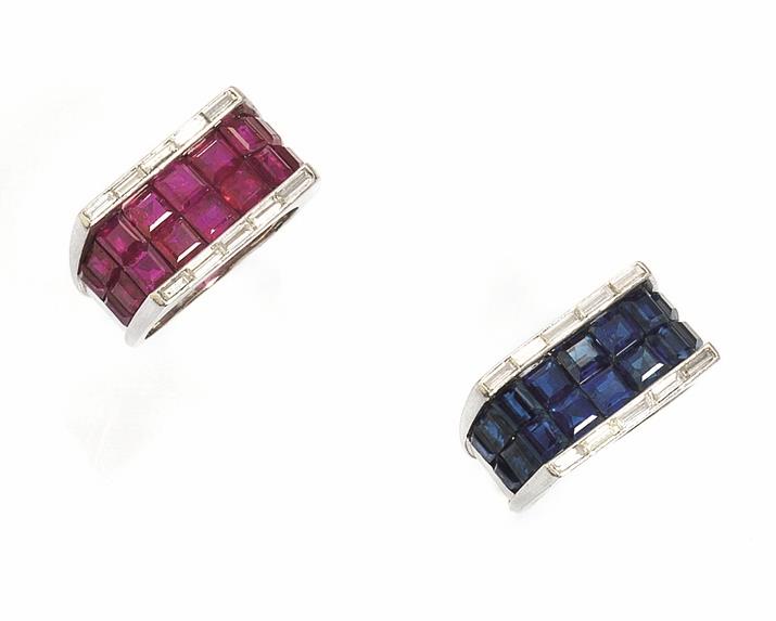 ciascuno di forma geometrica rispettivamente con rubini e zaffiri carre montatura invisibile entro due linee di diamanti baguette, g 18