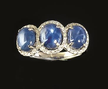 Lot 126 | ANELLO IN ORO BIANCO, ZAFFIRI STELLATI E DIAMANTIcon tre zaffiri asteria...