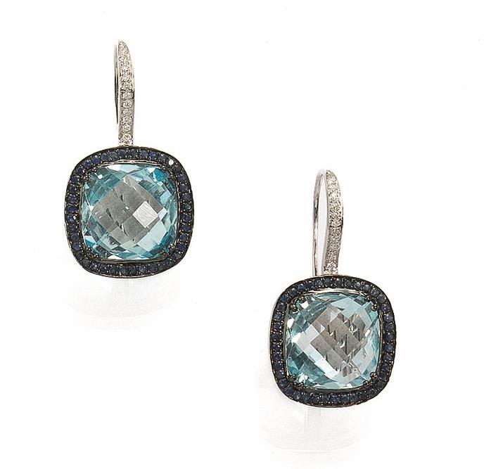 PAIO DI ORECCHINI PENDENTI IN ORO BIANCO, ZAFFIRI E TOPAZIciascuno realizzato...