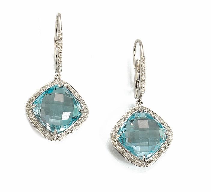 PAIO DI ORECCHINI PENDENTI IN ORO BIANCO, TOPAZI E DIAMANTI