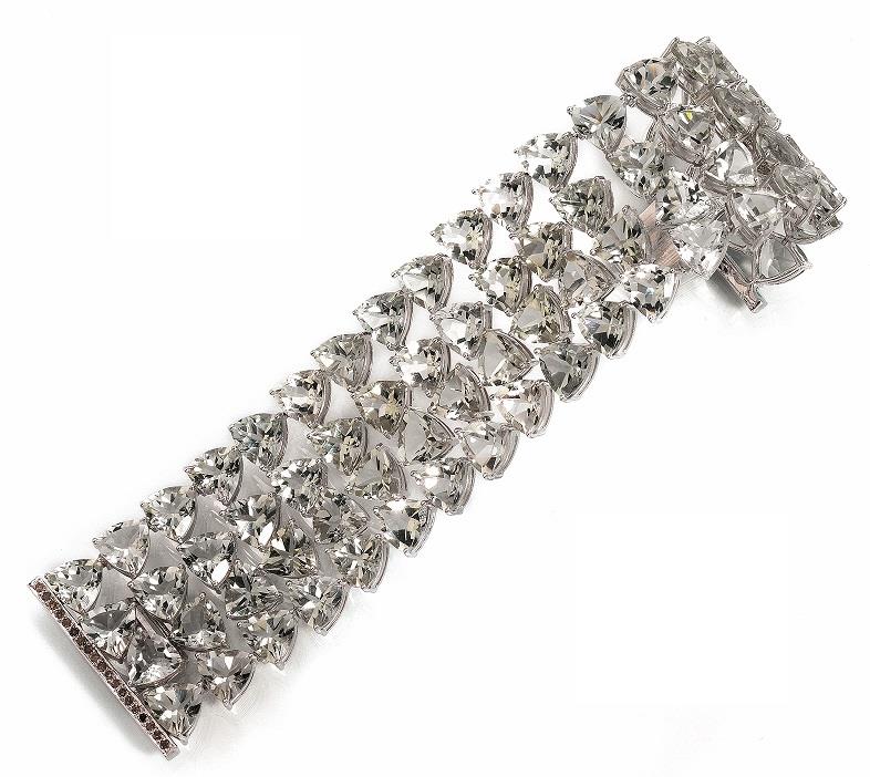 realizzato a fascia alta con quarzi a profilo triangolare, fermatura impreziosita da brillanti color champagne, g 74
