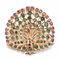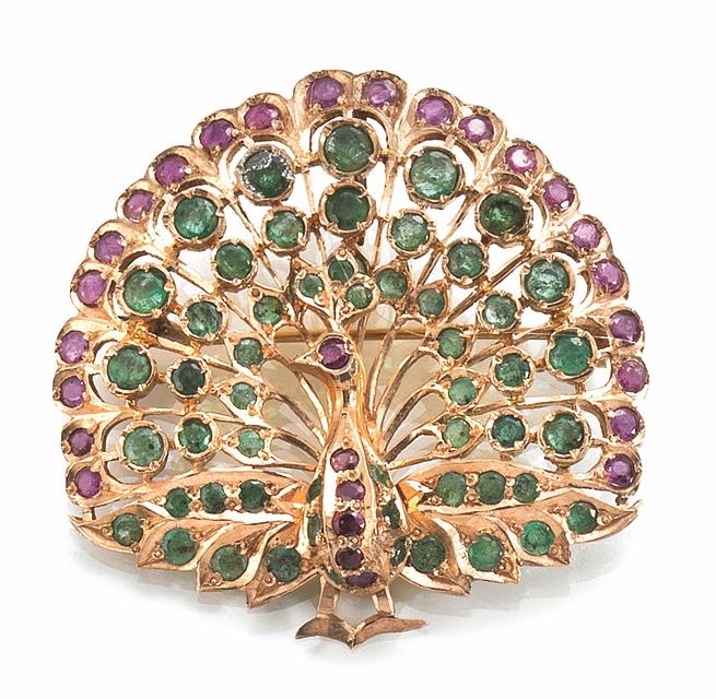modellata come un pavone interamente realizzato con montatura traforata con rubini e smeraldi di forma rotonda, g 20