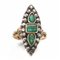rispettivamente modellato a marquise con smeraldi entro cornice in rose di diamante in oro giallo cesellato e argento e di forma ovale con doppia cornice in zaffiri e rose di diamante in oro giallo cesellato e argento, g 20