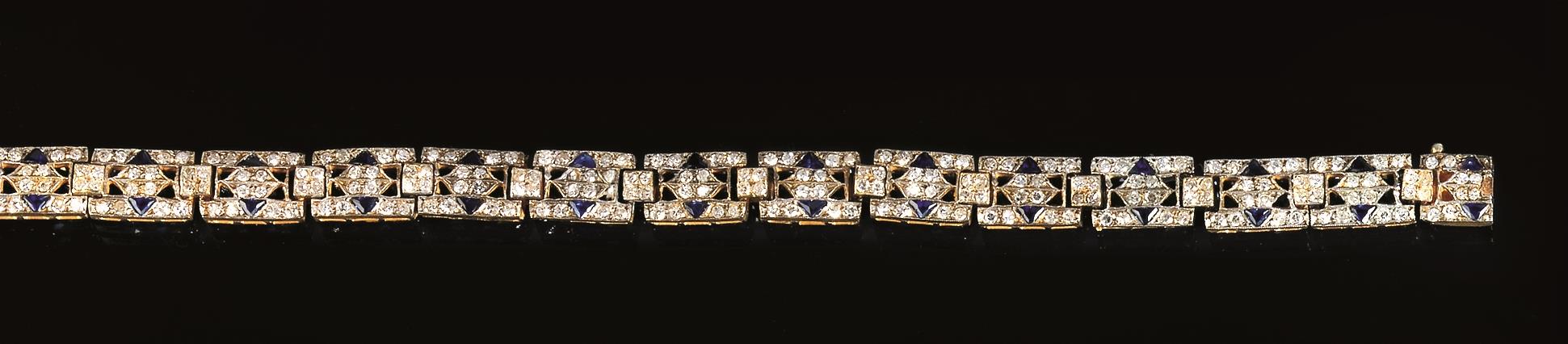realizzato ad una fila di placchette rettangolari traforate decorate da zaffiri triangolari e brillanti taglio huit huit, g 18